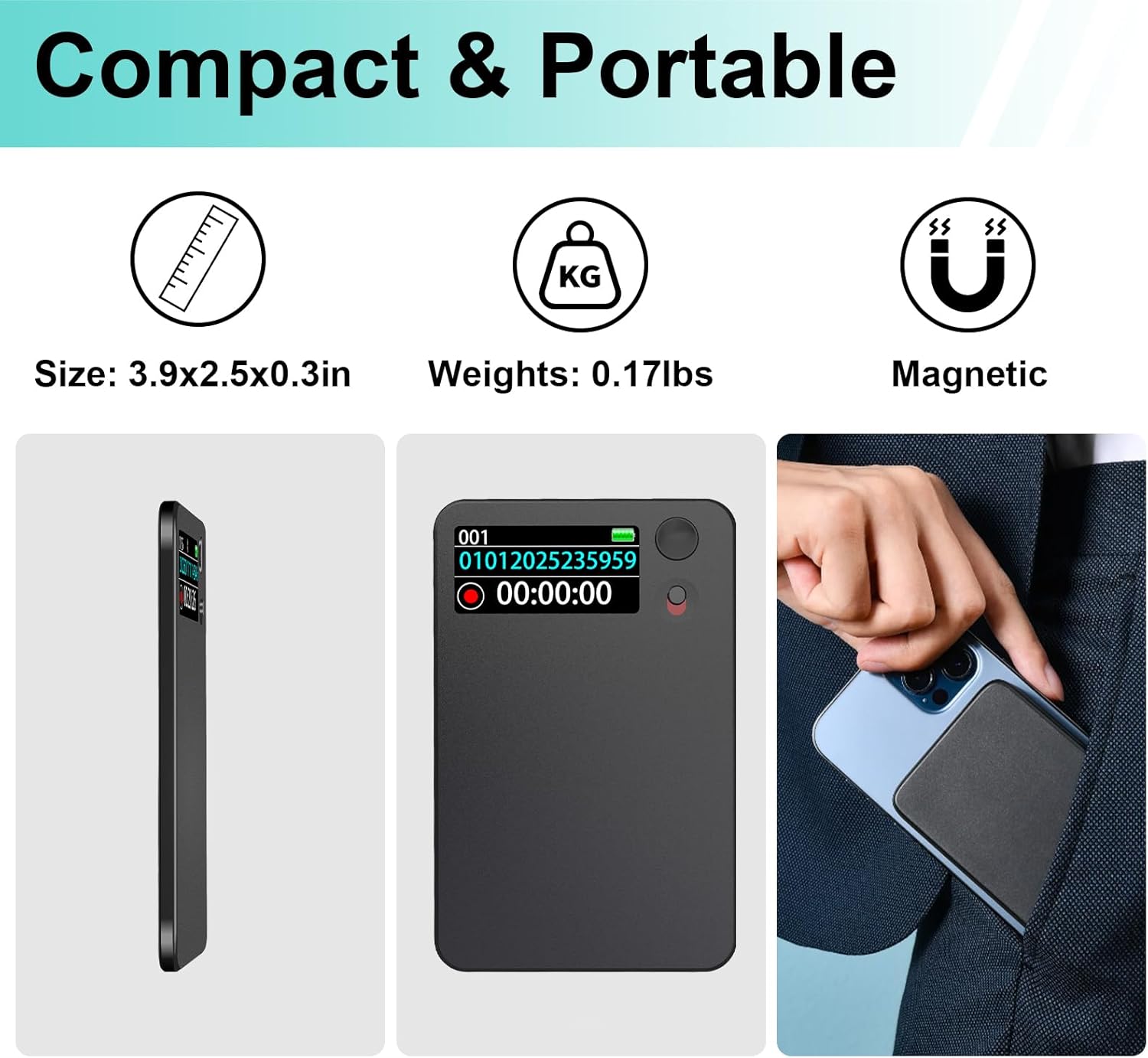 - Large Capacity and Sleek Design:This recorder has 64 GB of internal storage and can record up to 540 hours of audio. With a single battery charge, you can make up to 30 hours of continuous audio recordings. With a thickness of only 0.31 inches and weighing 33 grams, it fits perfectly on the back of your phone. The sleek, minimalist design is packed with powerful technology that will significantly improve your daily performance